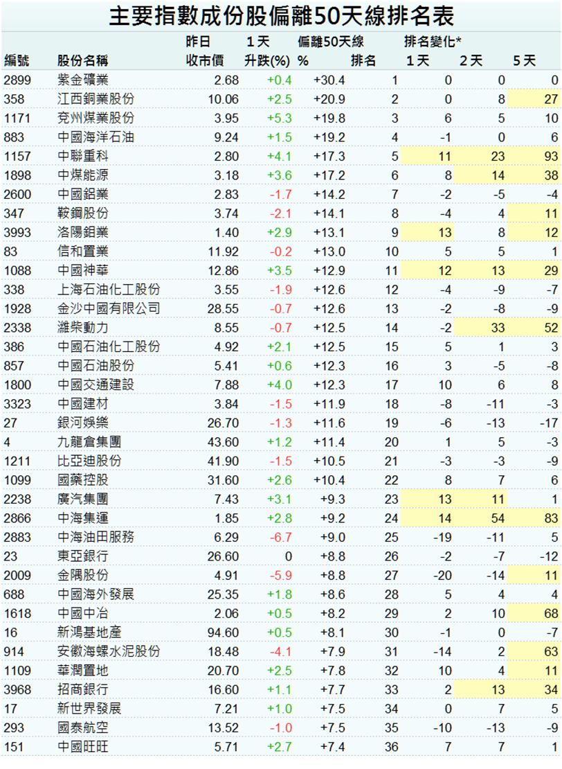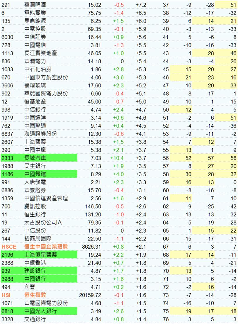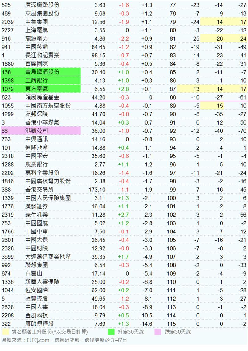 .指數成分股:86隻股價高於50天線,48隻下跌,9隻升穿及1隻跌穿50天線。長城汽車(02333
