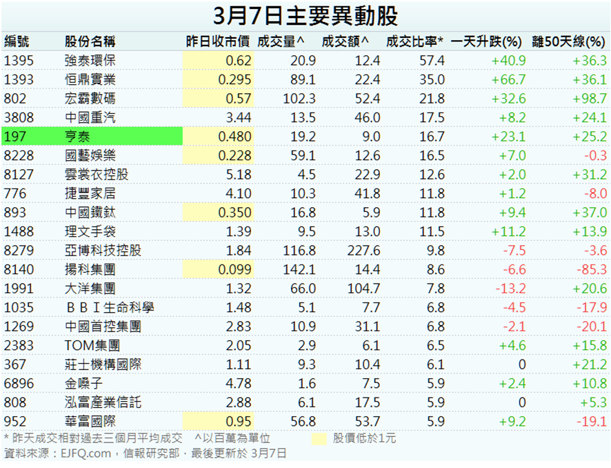 .異動股:13隻異動股逆市上升。亨泰(00197