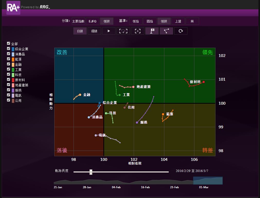 .板塊輪動:金融板塊的相對動力和表現上升。地產建築板塊的相對表現上升。工業和原材料兩個板塊的相對表現上升。消費品板塊的相對動力和表現下跌。服務板塊的相對表現和動力下跌。科技板塊的相對表現下跌。能源板塊的相對動力上升。公用事業板塊的相對動力和表現下跌。電訊板塊的相對表現下跌。(圖4)